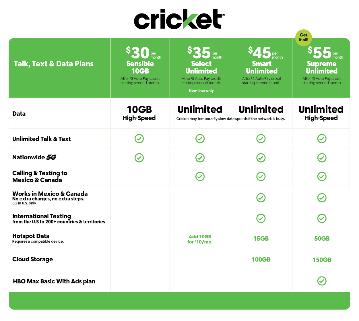“Cricket Wireless is committed to giving our customers the best value and experience in wireless,” said Angela Rittgers, president of Cricket Wireless. “Our new jaw-dropping plans don’t just offer great prices; they’re packed with features that customers need, from generous hotspot data to international perks. Whether customers want a simple plan or all the premium features, Cricket has something for everyone – with a reliable nationwide 5G network, great range of devices, and new plans to keep our customers connected on their terms.”